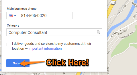 Now you will be shown a map to identify your business's location. You much agree to the Terms and Conditions before continuing: