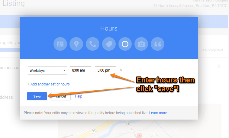 On the editing page you can edit your hours of operation, add photos, edit your business description, contact info, and location. It is always a great idea to add photos and be as specific as possible when you add your business introduction!