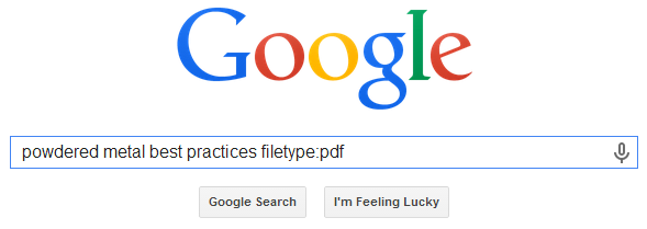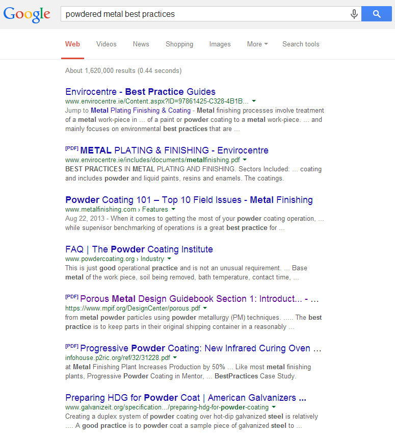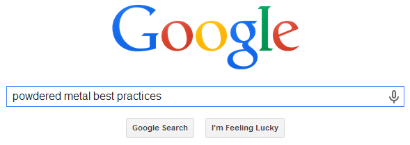 This is where the research actually begins. Let's type a keyword or phrase that someone in your industry might use to entice a website visitor to click and download their content. For example, let's say we're in the powdered metal industry. We might go to google and type something like this: