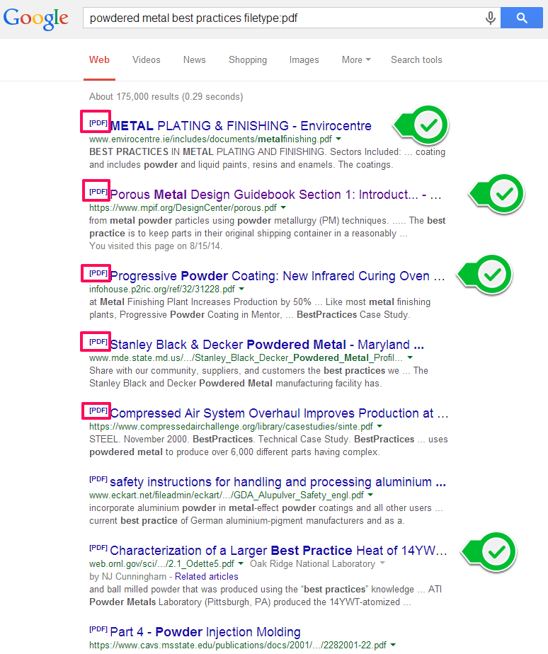 As I said above, the list of results is not perfect for finding industry mates that are using content marketing. Again, companies doing content marketing tend to post their lead bait as PDFs, so we can modify our original search, just slightly to find ONLY PDF files by adding a file type filter to the query like so: filetype:pdf: