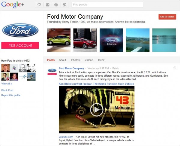 With the launch of Google+ a couple of weeks ago, everyone has had fun learning the ins and outs of how they can best utilize it for not only themselves (circle me), but for their brands. Many brands even went ahead and created accounts as a brand despite being against Google's wishes. It did not take long for those accounts to be removed or converted to an actual name of a person, hence +Mashable converting to +Pete Cashmore. Google is currently testing accounts for brands (see Ford example below), but what is next for them? ...I have my opinions on what I'd like to see.