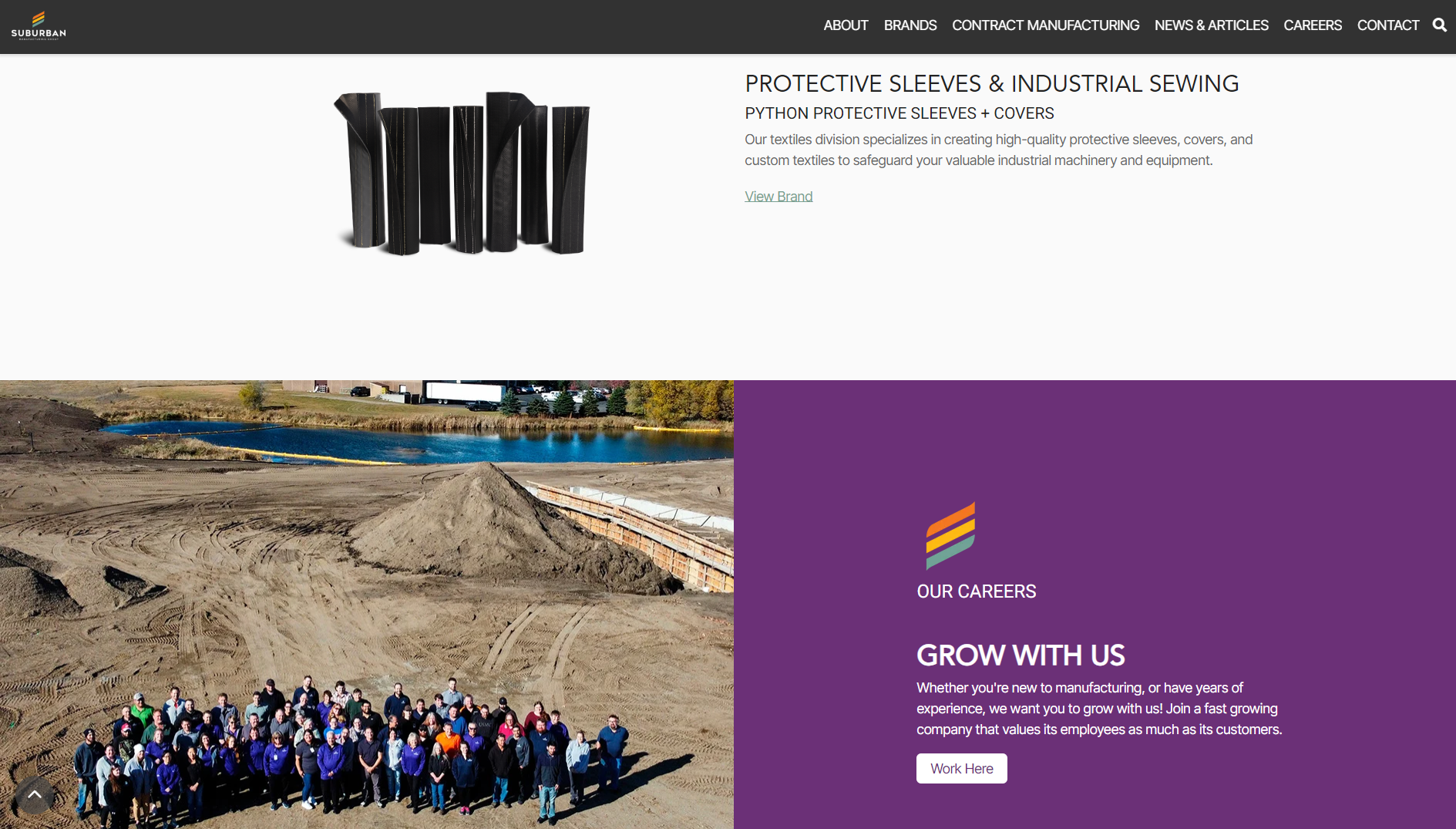 The image and copy clearly identify one of Suburban's product lines as well as the opportunity to apply for a job. Further down, there are an "About Us" video and contact information.